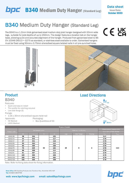 The B340 is a medium duty timber-to-timber hanger designed to provide a strong, reliable connection between joists. It offers a quick and secure method of joist trimming for heavier applications such as supporting floor joists, beams, and trimmers around openings. The B340 features optimised hole positioning and reinforced construction to ensure maximum load distribution and stability across the connection area.