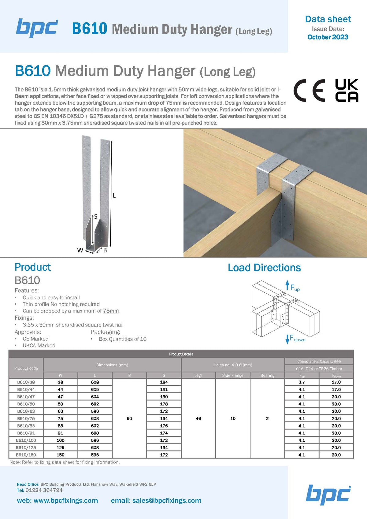 The B610 is a medium duty timber-to-timber hanger designed for reliable and secure structural connections. It provides a fast, efficient, and safe method of joist trimming for medium to heavy-duty applications, including supporting floor joists, beams, and trimmers around stairwells, hatches, and other openings. Constructed from galvanised steel for superior strength and corrosion resistance, the B610 features optimised nail hole spacing to ensure maximum load distribution and long-term stability in timber structures.